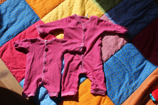 Vroeger, toen elke zondag een oom en tante bij ons op bezoek kwamen, dacht ik altijd: “die zijn raar”. Elke zondag riepen zei reuze enthousiast: ” He!! Jullie zijn weer gegroeid!!” Nu als kersverse moeder begrijp ik pas echt wat zij bedoelden.De twee pyjamaatjes zijn allebei van onze kleine meid, de een kreeg ze an toen zij geboren werd, de ander draagt zij nu, 12 weken later. Dat gaat rap! |