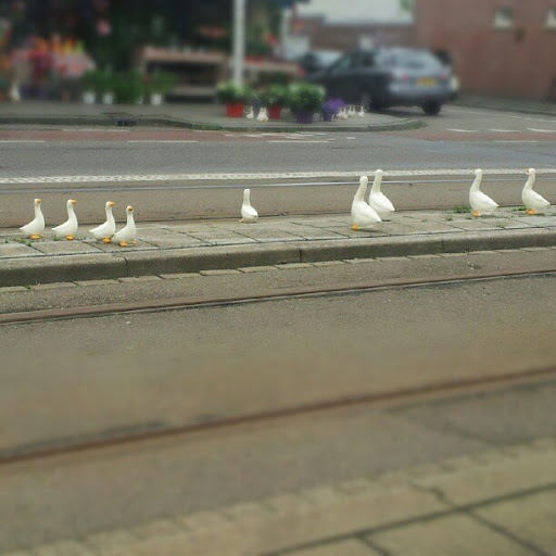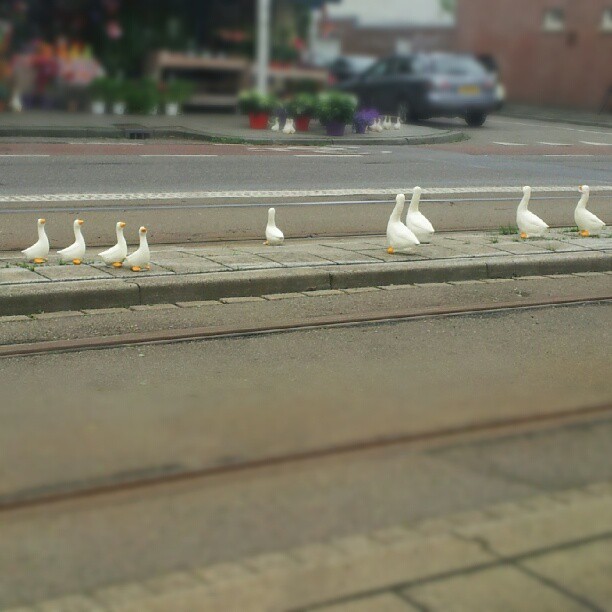 Kijk, deze eenden kwam ik zomaar tegen bij de halte van de tram. Waar zouden ze naar toe gaan? Nu ik er een beetje op let zie ik het steeds vaker. Grappige, mooie en rare toevoegingen aan de normale dingen op straat. Houten eendjes bij de tam, sjaaltjes om een boom en een piepklein mannetje levensecht geschilderd op de voet van een stoplichtpaal. Ik vind het een vrolijk tegendraads idee, zomaar iets geks toevoegen aan de wereld om je heen. Extra kleur in de soms zo grijze stad. En echt, als je er op let, zie je er meer en meer. Hebben jullie al iets gespot? |