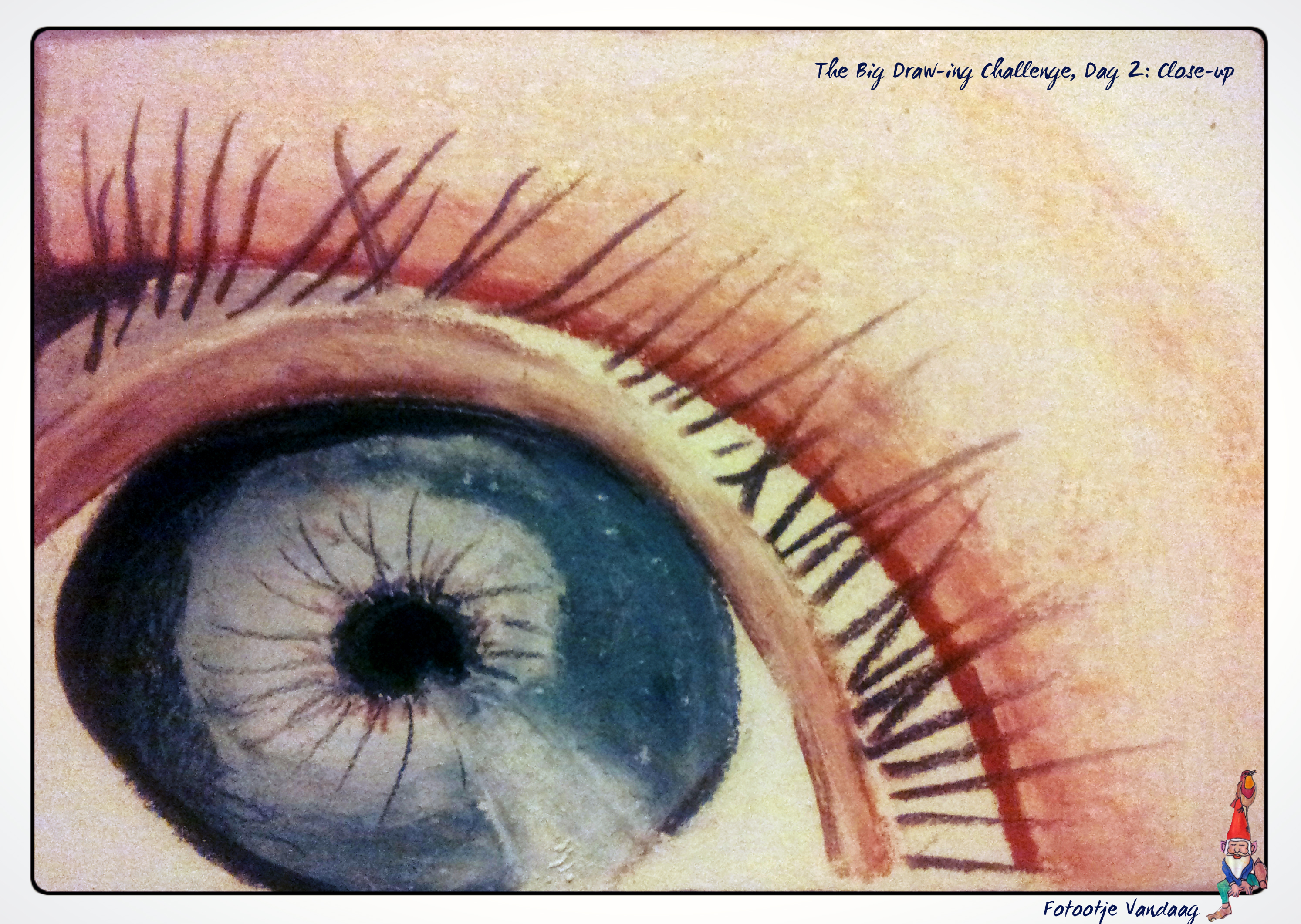Voelt u zich nu een beetje bekeken? Ik eerlijk gezegd wel, zo met dat grote oog dat mij hier al tijdens het typen aanstaart. Maar ja, het moest vandaag wel, aangezien het teken thema van de Big Draw-ing Challenge vandaag Close-Up bleek te zijn!