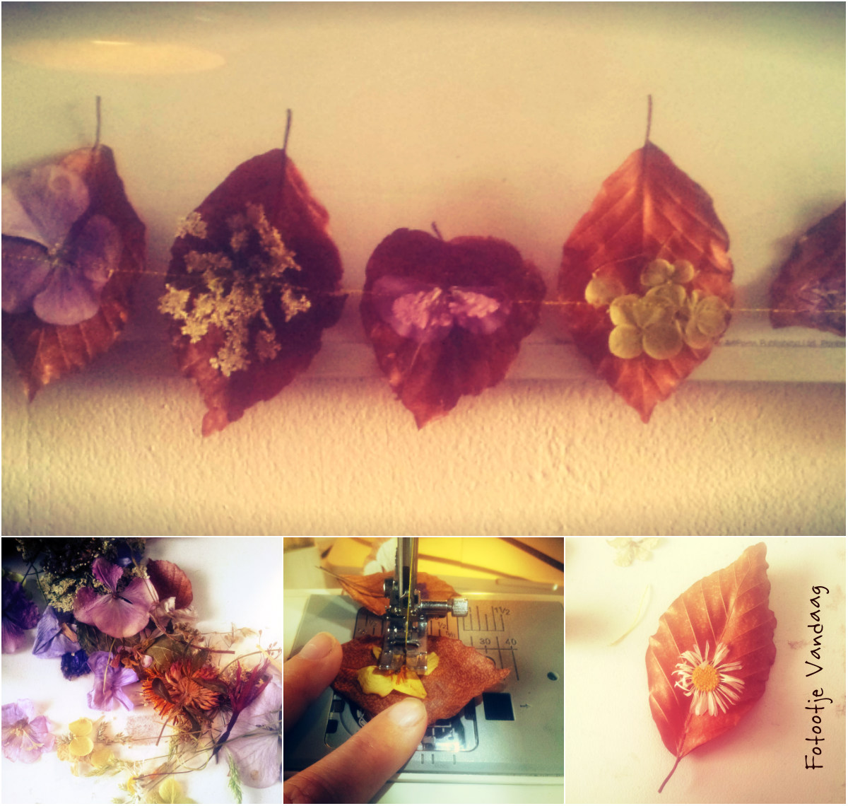 blaadjes slingerIn de warme zomermaanden plukte ik naar hartelust mooie bloementjes. Ik legde ze te drogen in dikke boeken, voelde voorzichtig aan de tere kleuren. Het doosje raakte gedurende de zomer steeds voller en werd in de herfst nog eens extra gevuld met gevallen bladeren. Hoogste tijd om de naaimachine uit de kast te halen en van deze natuurschatten een vrolijke slinger te maken. Heel voorzichtig naaide ik de bloempjes en de blaadjes aan elkaar en zie hier het resultaat.