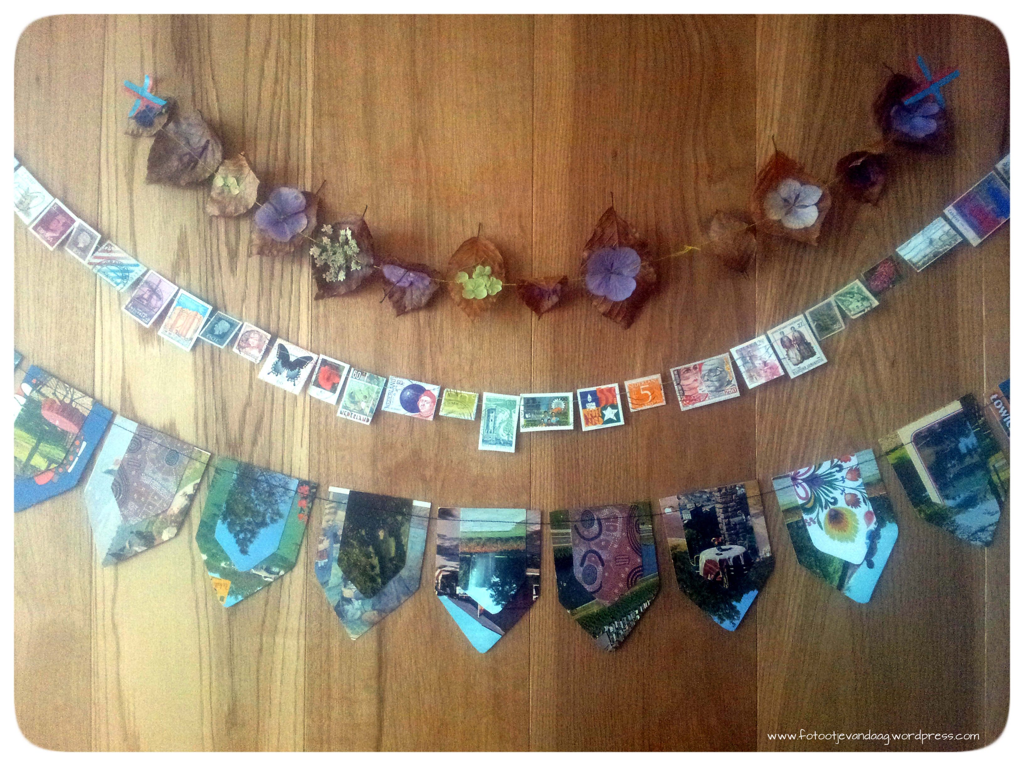 Het maken van slingers is iets wat ik de laatste tijd graag doe. Postzegels, ansichtkaarten, bloementjes en blaadjes, alles haal ik onder de naaimachine door. Ik weet niet wat het is. Vind ik alle dagen feest? Nee, alles behalve dat eerlijk gezegd. Ik vermoed dat ik met het maken van die slingers elke keer denkbeeldig ook in mijn eigen hoofd een slingertje ophang, als een soort vlaggetje in de mist.