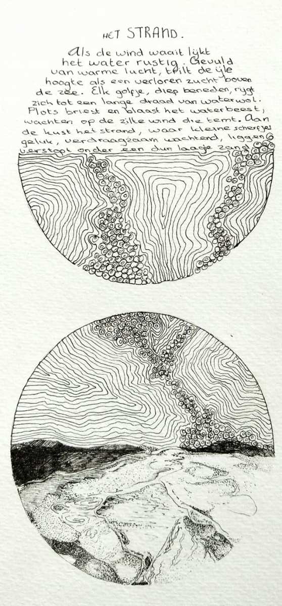 Als de wind waait lijkt het water rustig. Gevuld van warme lucht, trilt de ijle hoogte als een verloren zucht boven de zee. Elk golfje, diep beneden, rijgt zich tot een lange draad van waterwol. Plots briest en blaast het waterbeest, wachtend op de zilte wind die temt. Aan de kust het strand, waar kleine scherfjes geluk, verdraagzaam wachtend, verstopt liggen onder een dun laagje zand.