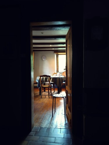 Door de raampjes glooit een berg, of eigenlijk eerder een heuvel, de dennen en beuken staan kriskras door elkaar. Een zacht kraaiend geluid golft over het groen, een auerhoen misschien.