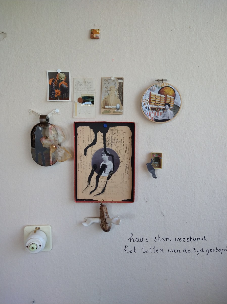 Ik maak gedetailleerde composities die opgebouwd zijn uit kleine tekeningen en schilderijen, foto’s, knipsels, voorwerpen, brieven, oude persoonlijke papieren, flarden tekst of gedroogde vondsten uit de natuur. Elke compositie wordt zo een op zichzelf staande, maar onaffe en rafelige wereld. Als kijker moet je je weg zien te vinden in deze opsomming van al dan niet fictieve herinneringen.